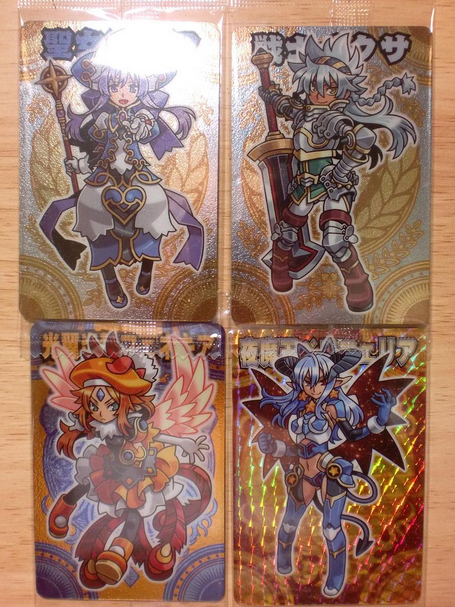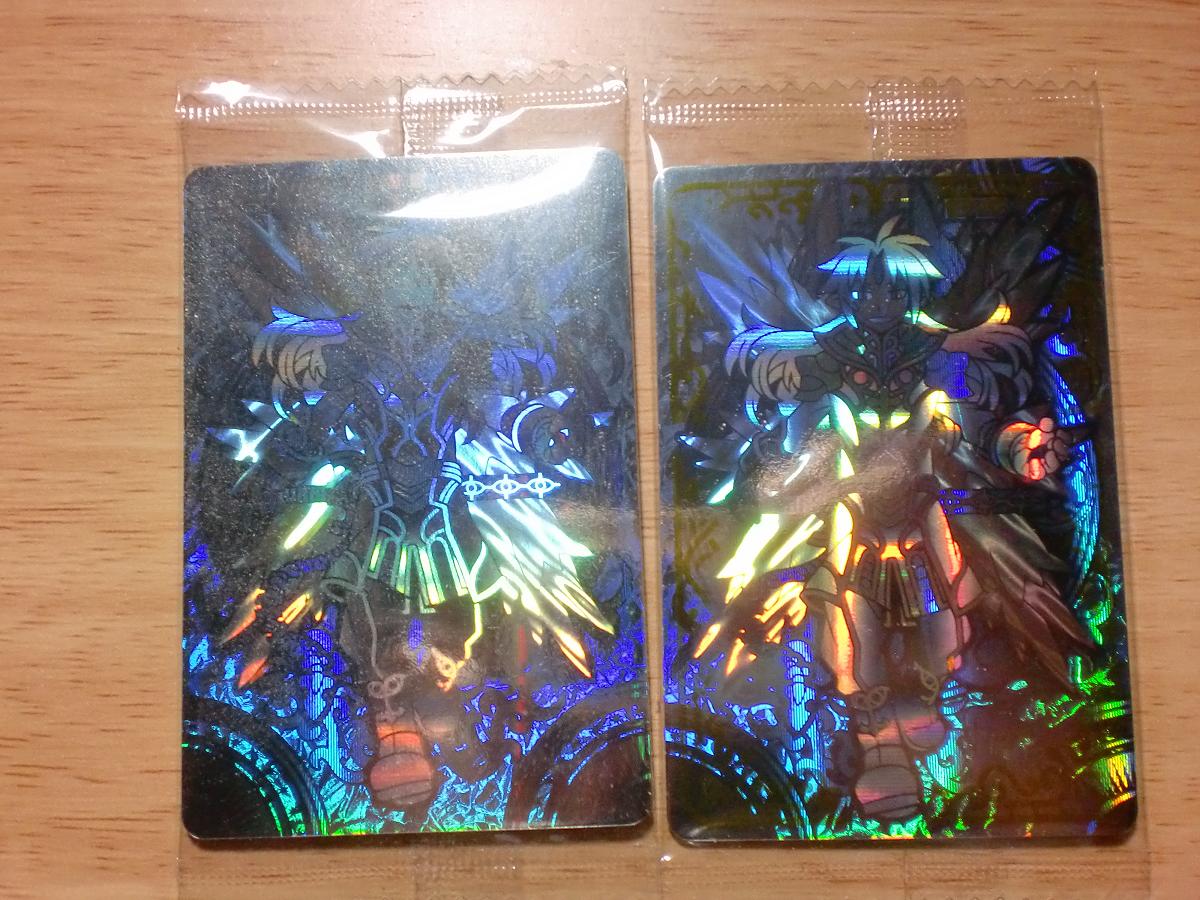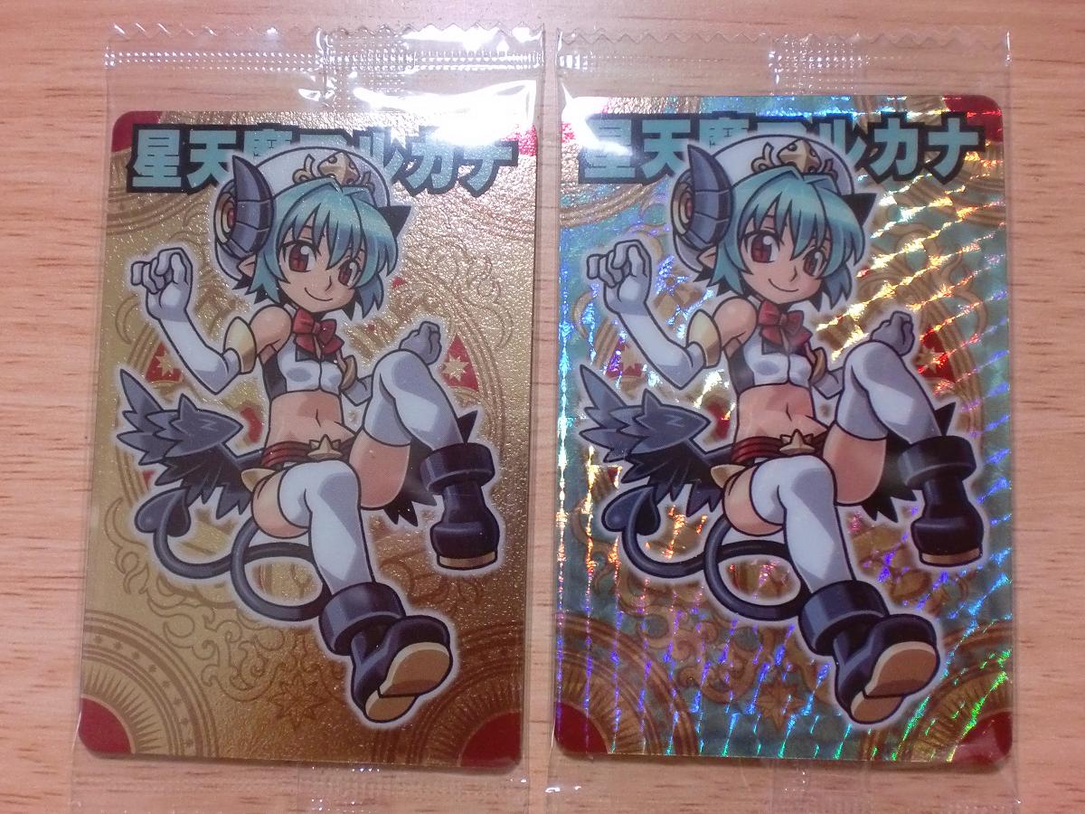 「大魔王と八つの柱駒」の戦果でもレポートしちゃいましょう! 今回は64枚分購入してみた結果がこちら(枚数は含めず) ↓ PR 大魔王アーク(ミラージュ) PR 大魔王アーク(アナザーミラージュ) 002 賢人王ファウスト 003 聖女アリア 004 勇者ヒイロ 005 戦士イクサ 006 魔法使いマジコ 007 僧侶ミスト 009 星天魔アルカナ 010 光魔王ルキフェール 011 夜魔王ベルフェリア 012 獣魔王マーモン 013 光翼炎舞フェネキア 014 騎迅炎魔ガミジン 015 轟破水魔モラクス 016 傷心天使ムクムク 017 鋼竜子爵バサルト 018 魔蛸子爵タッコルド 019 海老男爵スクリンプ 020 妖魔子爵リトビー 021 怪魔男爵カルドディーモ 022 ペンギン男爵アグムース 023 シロクマ男爵ベアラード 024 鎧角子爵ラベーオ 025 白蟻男爵ターマイティス 026 妖花道化フィオレーテ 027 魔女ババロア P05 星天魔アルカナ 今回は普通に購入して手に入るカード自体はほぼ入手しましたが、 やはり厄介なのは各限定カードですなぁ・・・ サンクス限定のアルカナちゃんは手に入ったんだけど、他が全然手に入らず・・・ 何で近くのセブンはどこも神羅入荷してねーんですかね!!1! ビックリマンはあるのにね・・・ コロコロ限定と神羅フロンティア限定はスルーしてたりします ・・・入手方法がめどいので あと八柱チャレンジの結果も以下のとおりです 合計64回中 章コイン 9枚 Sポイント 2個 ルキフェール 1枚 アバターアイテム 6個 ハハハ ・・・無残すぎる・・・ 初日だと結構当たりが多かったと報告があってすげー損した気分・・・ 初日は仕事でコード入力する暇なんて無かったヨ!!クソァ!! やはり今回も神羅女性キャラクター陣はかわいいのう! ベルフェリアさんが特にお気に入りです、それにしても魔界住民の方々がどれもいい人そうで吹く これもアークさんの人徳やらのおかげなのかな? あとアルカナちゃんがどうみてもルキアの子孫かなにかにしか見えない・・・ もしそうだとしたら神羅ファン的にスゴク嬉しいんだけどさ そういやブログ記事書いてる途中で気がついたんだけど、サンクスで貰えるマジコって 通常マジコと同じカードだったんだね・・・(HPにも書いてたのに見落としてた・・・) ミラージュアークのカードに関しては うおっ!まぶし! 過ぎだヨ! 最初にカード開封して出てきたときはすげー!超レアなんじゃね!??って思わせといて 全然レアじゃないとかガッカリすぎる・・・ ・ ・ 現状結果で満足してるため今弾に関してはこれ以上チョコ買ってませんが、 まだフロンティア限定カードとか手に入るのなら買い続けてみようかなぁ・・・・ |
