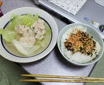 つみれとキャベツのスープとふりかけご飯